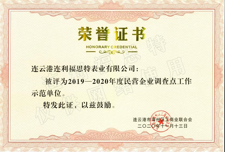 近日,連云港連利福思特表業(yè)有限公司榮獲“2019-2020年度民營企業(yè)調(diào)查點(diǎn)工作示范單位”稱號(hào)。 民營企...